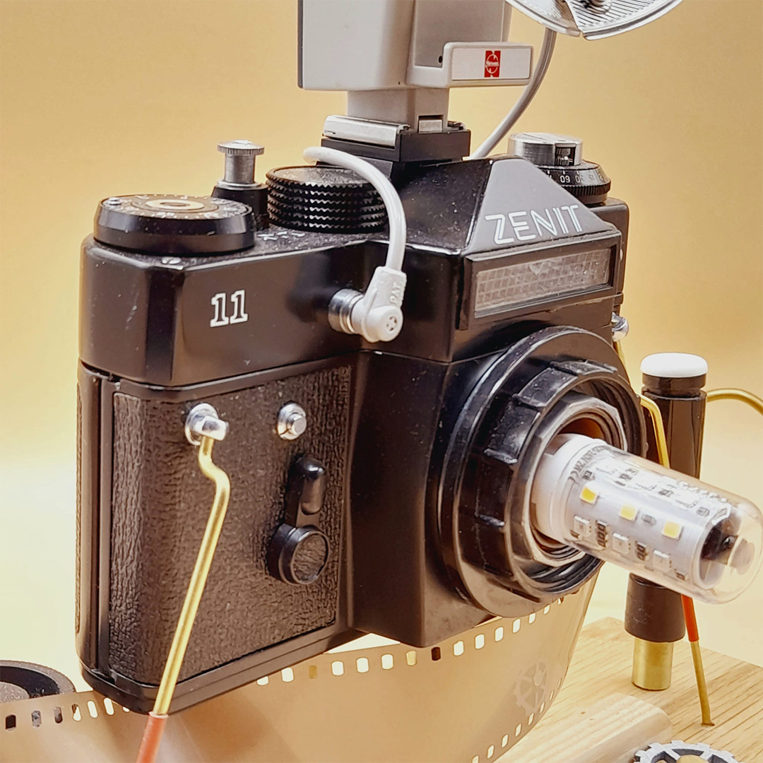 Converted black Zenit camera lamp.
